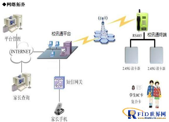 本方案主要用于学校考勤信息管理。当学生(或教师)佩戴2.4G当有源复合卡通过校门进入或离开学校时,远程读卡器将读取学生卡的信息,并通过 RS485 电缆传输到学校的校讯通终端,校讯通终端通过移动GSM/GPRS通道将考勤记录发送到校讯通平台,平台向家长手机发送安全短信。本方案保留了校讯系统原有的家庭电话功能,2.4G集成了有源复合卡ID卡功能,学生可以直接在终端刷卡。