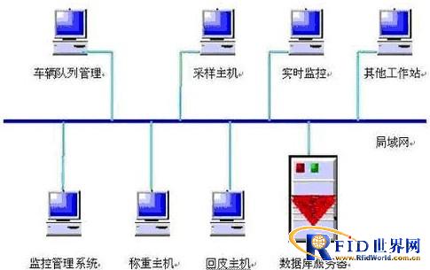 该系统的网络拓扑结构如图1所示。其中包括:监控管理系统、车辆队列管理、称重主机、采样主机、皮革主机、实时监控、数据库服务器等在线工作站。各单元系统通过工厂局域网连接,实现数据共享。